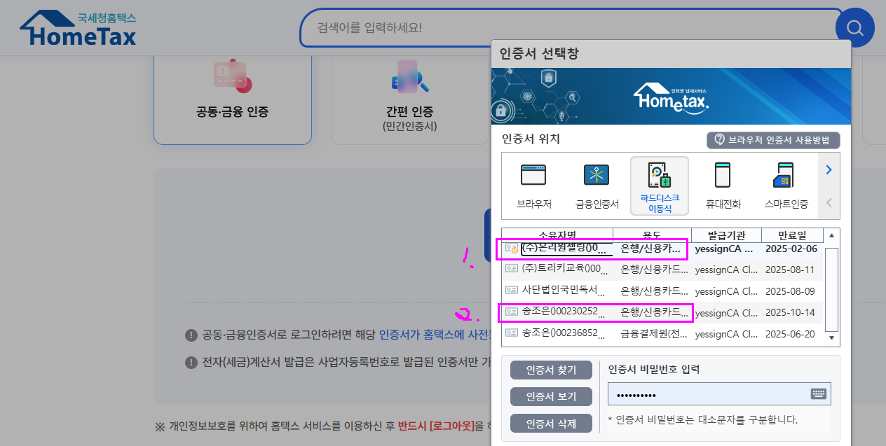 홈텍스 인증서 선택 / 공동인증서 파일 저장 위치